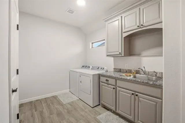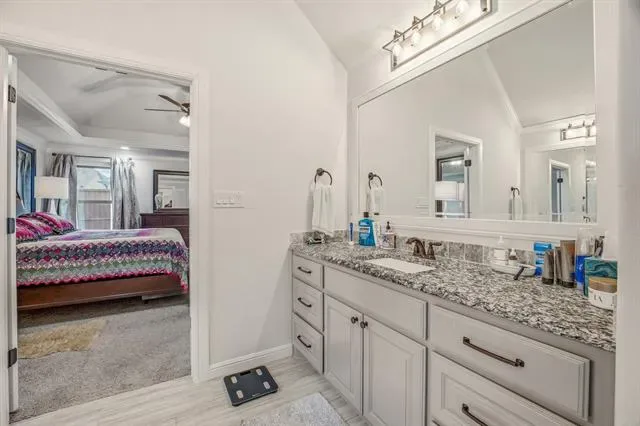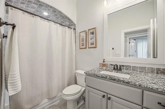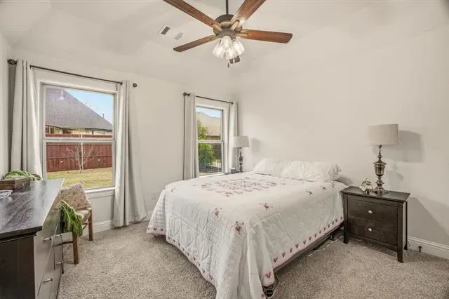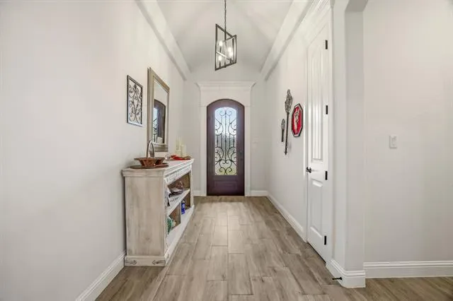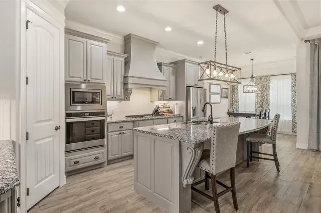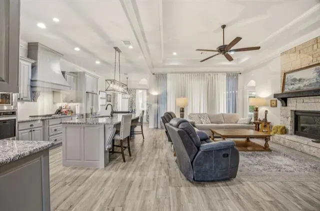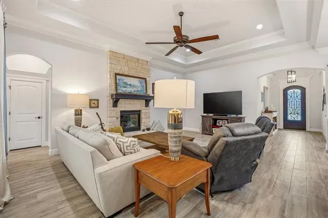 Located in the sought-after Harbor Lakes community in Granbury, this 2021 Couto-built home reflects quality construction and thoughtful design throughout. The open layout centers around a spacious kitchen with granite countertops, gas cooktop, and a large island overlooking the living area. A stone fireplace anchors the room, while tray ceilings with detailed crown moulding add architectural depth without overpowering the space. Wood-look tile flooring runs through the main living areas, offering the warmth of hardwood with durability and easy maintenance.