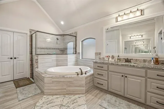 The primary suite includes an ensuite bath with garden tub, separate shower, dual vanities, and a walk-in closet. The floor plan flows comfortably from room to room, balancing everyday function with refined finishes.