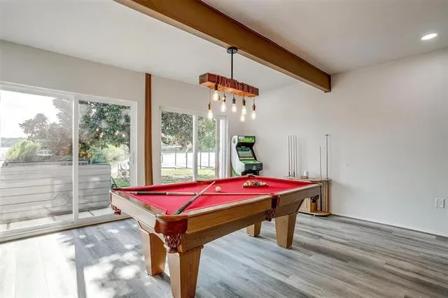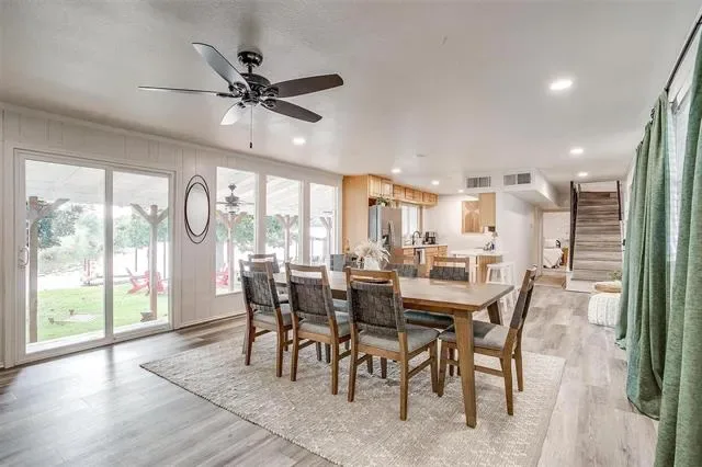 Step inside to find two spacious living areas, including a dedicated game room complete with a pool table and panoramic views of the lake—ideal for entertaining family and friends. The open-concept living and dining spaces flow seamlessly, filled with natural light and warm Texas character.