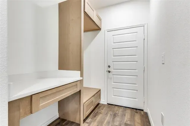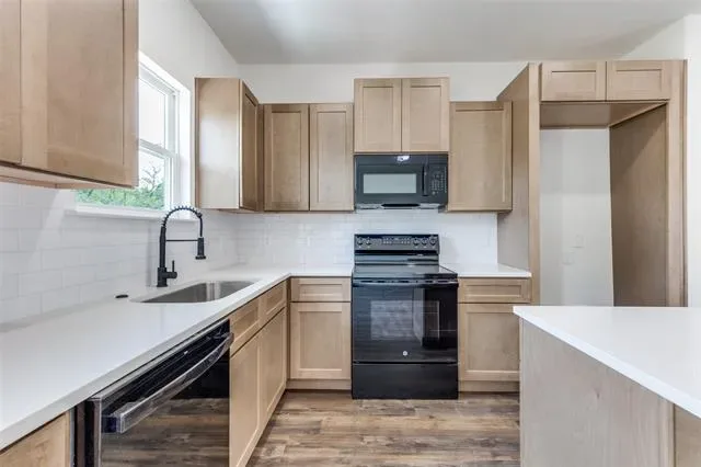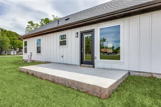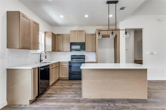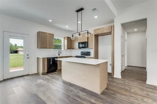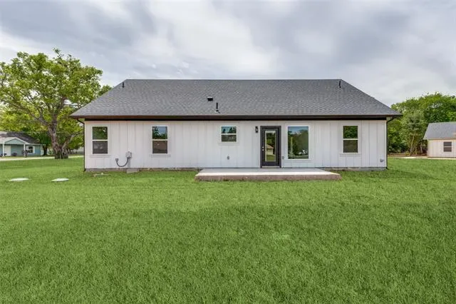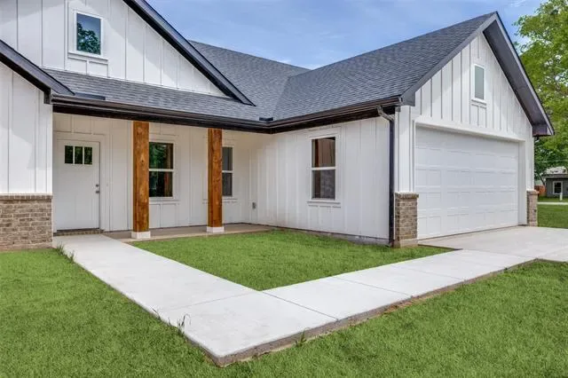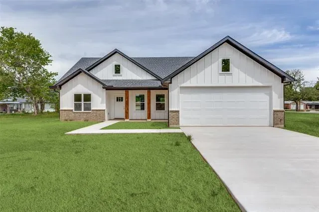 Welcome to this stunning new construction Modern Farmhouse! This thoughtfully designed 3-bedroom, 2-bath home offers an open-concept layout perfect for modern living. The chef-inspired kitchen features custom shaker cabinets, quartz countertops, subway tile backsplash, a large center island with pendant lighting, stainless sink with black pull-down faucet, and all black GE appliances including electric range, microwave, and dishwasher. A walk-through pantry provides generous storage. The spacious living room flows seamlessly into the dining area, ideal for entertaining. The primary suite boasts a tray ceiling with ceiling fan, walk-in closet, and private en-suite bath. Two additional bedrooms share a well-appointed full bath. The built-in mudroom with custom cabinetry and bench seating off the garage entry adds everyday functionality. Luxury vinyl plank flooring throughout main living areas with plush carpet in bedrooms. Attached 2-car garage. Board and batten siding with brick accents give this home standout curb appeal. Move-in ready!