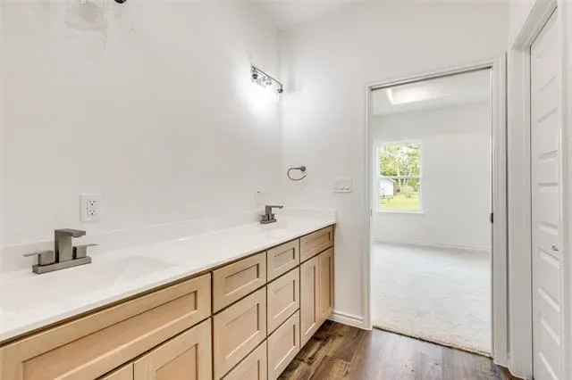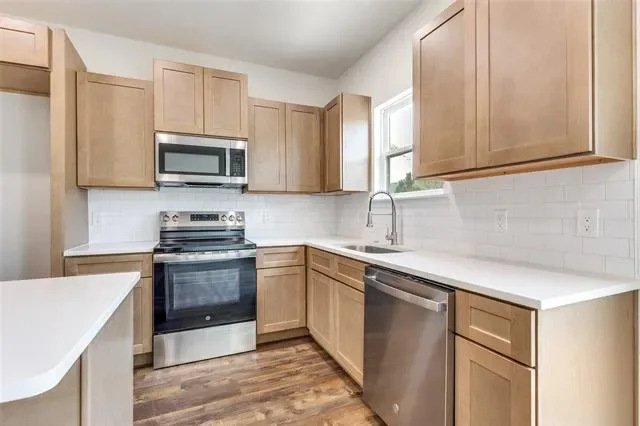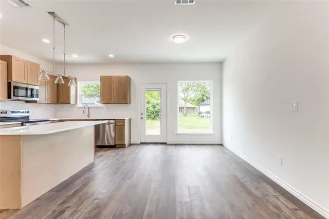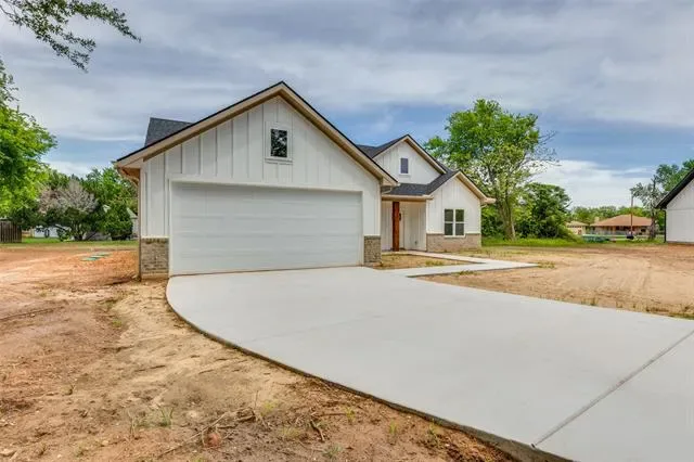 Step into this brand-new Modern Farmhouse beauty offering an ideal single-story layout in the sought-after Indian Harbor Ph 1 community. This well-crafted 3-bedroom, 2-bath home showcases an inviting open-concept design perfect for everyday living and entertaining. The thoughtfully appointed kitchen boasts custom shaker-style cabinetry, quartz countertops, a large center island, subway tile backsplash, stainless sink with pull-down faucet, and all GE appliances including electric range, microwave, and dishwasher. A dedicated pantry provides ample storage. The expansive living area opens seamlessly to the dining space, ideal for gatherings. The primary suite features a tray ceiling, ceiling fan, private en-suite bath, and spacious walk-in closet. Two additional bedrooms share a well-equipped full bath. Practical built-in mudroom space off the garage entry adds daily convenience. Luxury vinyl plank flooring throughout main living areas with plush carpet in bedrooms. Attached 2-car garage. Classic board and batten exterior with brick accents delivers standout curb appeal. Move-in ready!
