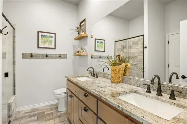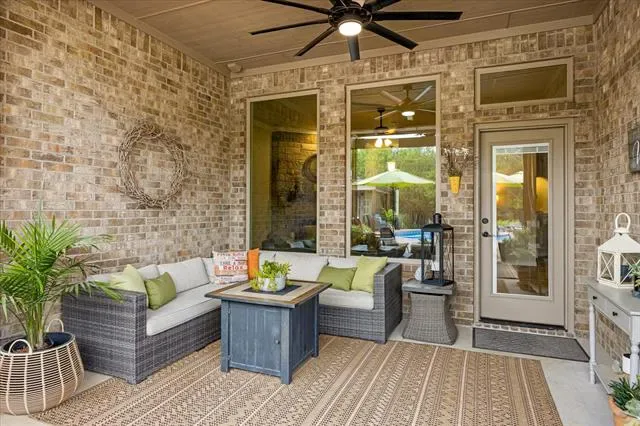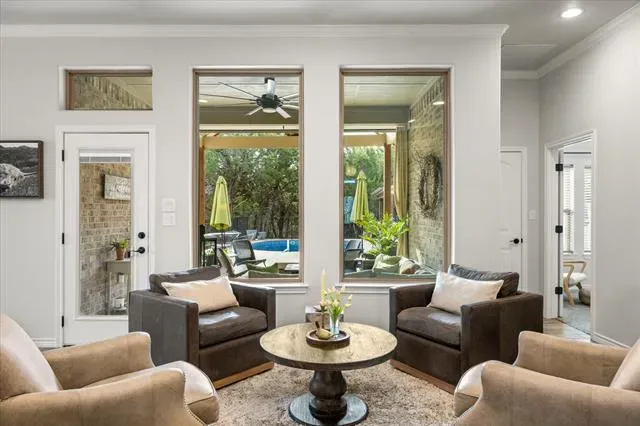 Inside, the design is equally impressive with a beautiful, cohesive color palette, designer lighting, and gorgeous window treatments. The open floor plan offers seamless indoor-outdoor flow and pool views from the main living areas. The split layout provides a true spa-like primary suite with peaceful views of the landscaped pool area, while three additional bedrooms sit privately on the opposite wing. High ceilings, foam insulation for efficiency and comfort, wood-plank-look ceramic tile floors, light-stained knotty alder cabinetry, and STORAGE, STORAGE, STORAGE complete this standout home.