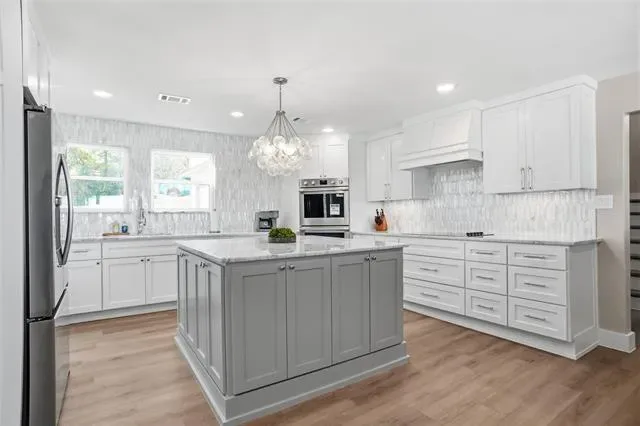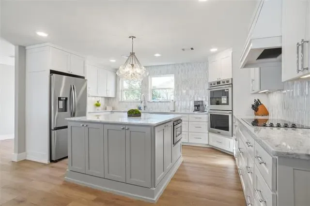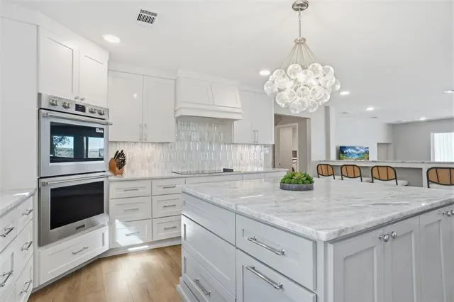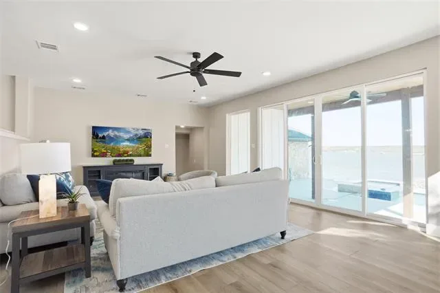 Step inside to an open, airy layout flooded with natural light and anchored by panoramic water views from nearly every room. The designer kitchen features marble counters, custom cabinetry, double ovens, and a show-stopping oversized island—perfect for gathering with family and friends before heading outside for lake-day fun. The spacious living area opens wide to the expansive patio and pool deck, creating seamless indoor-outdoor living.