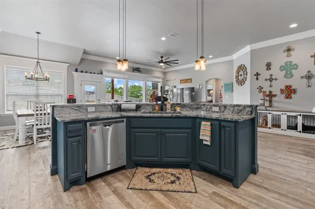 Sitting on over an acre, this custom home stands out with thoughtful design and modern upgrades throughout. Vaulted ceilings and an open concept layout create a light, open feel that is perfect for everyday living and entertaining. Custom trim work, cabinetry, and designer tile flooring are paired with modern finishes that give the home a clean, elevated look while still feeling warm and welcoming.