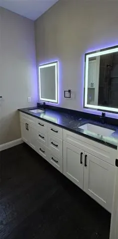 Additional highlights include two secondary bedrooms with large closets and a fourth bedroom with impressive 15-foot ceilings, a spacious laundry room with plenty of storage, and a garage with wainscoting and finished epoxy flooring. Second bath also features gorgeous stone and high end touches like anti-fog mirrors.
