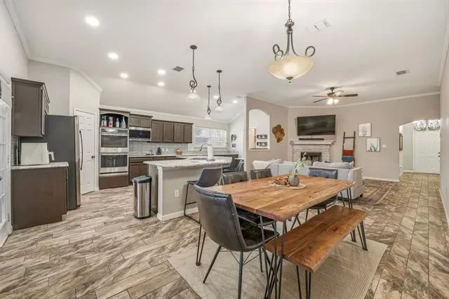 The heart of the home is the spacious kitchen, showcasing smart double ovens, a large island with seating for six, a built-in desk, and abundant storage, making it ideal for both everyday living and entertaining. Wood-look tile flooring flows through the main living areas, while the living room is anchored by a cozy wood-burning fireplace.