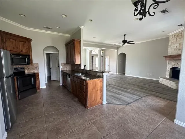 Meander Estates gem ready for new owners! Sitting on just over a quarter acre, and outside the city limits, this is your ranch-style dream home, and comes complete with a beautiful Austin stone fireplace, open kitchen with breakfast bar, custom cabinets, granite countertops, and stainless steel appliances. The primary suite features a custom tray ceiling, dual vanity, jetted tub, and huge walk in closet.