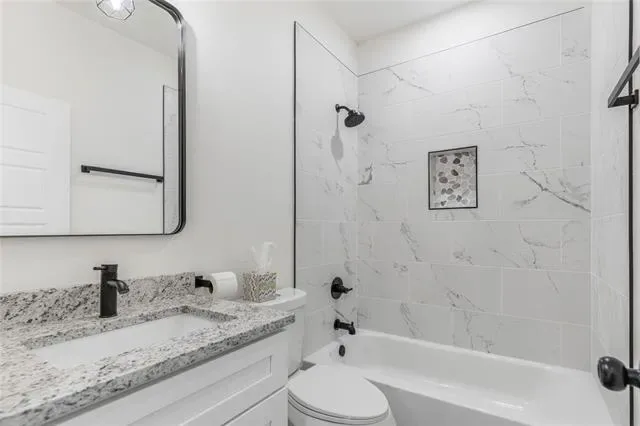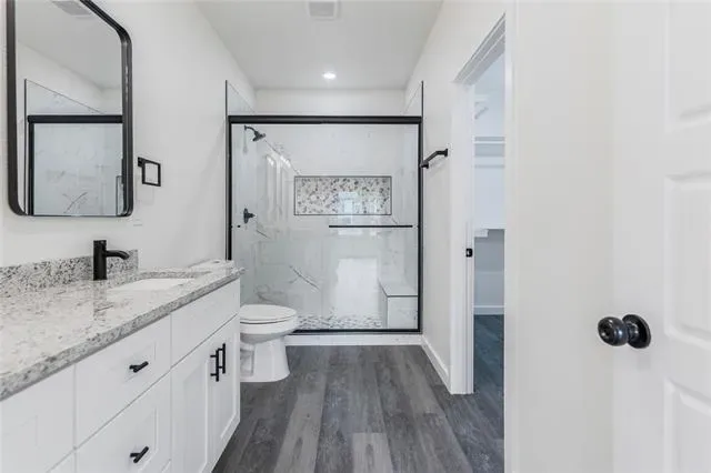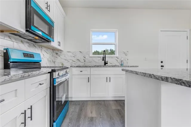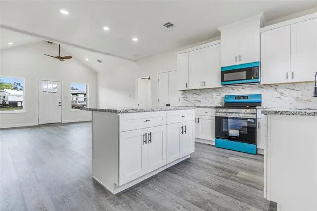 The kitchen showcases clean and modern cabinetry, granite countertops, stylish backsplash, stainless steel appliances, and a large island ideal for gatherings.The main bedroom has a spa-like bathroom with a walk-in tiled shower, double vanity, and generous closet space. Durable luxury vinyl plank flooring flows throughout the home, combining style and easy maintenance.