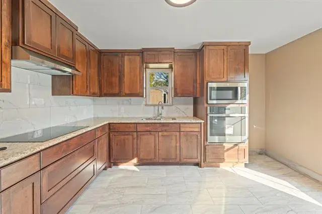 The heart of the home is the stunning kitchen, featuring rich wood cabinetry, a marble-look backsplash, granite countertops, and stainless steel appliances. Thoughtfully designed, it offers ample storage and prep space to make cooking a delight.