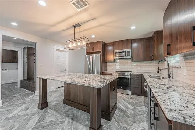 Inside, soaring vaulted ceilings and an open-concept layout fill the living spaces with natural light. The gourmet kitchen showcases high-quality wood cabinetry, tons of counter space, plenty of cabinets for storage, and a large island perfect for entertaining. A walk-in pantry provides even more space and organization. The kitchen comes complete with stainless steel appliances, including the refrigerator, making it both beautiful and functional. The living room impresses with its dramatic ceiling height, decorative lighting, and a sleek iron ladder that leads up to a bonus loft space enhanced by a live-edge wood bench that adds warmth, function, and a unique touch of character.
