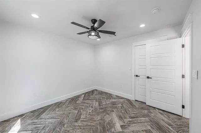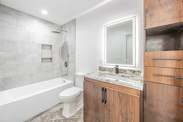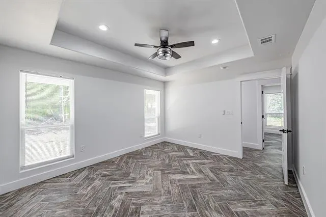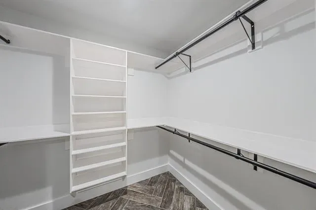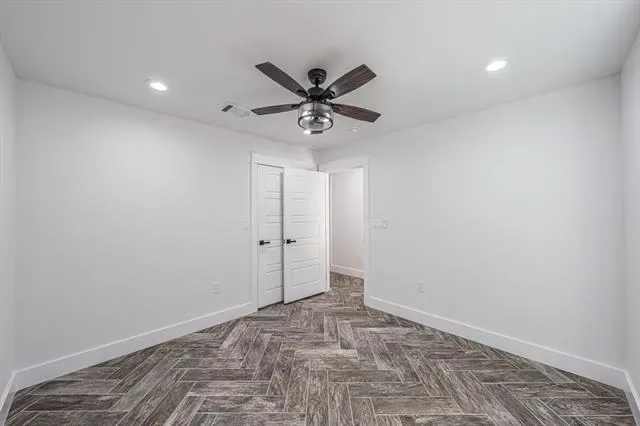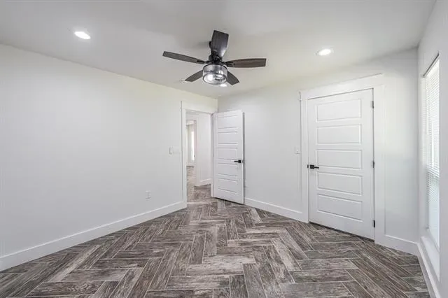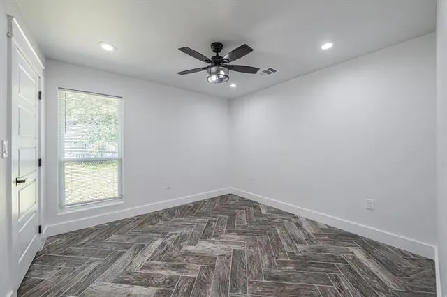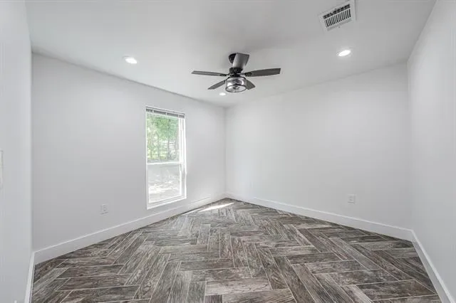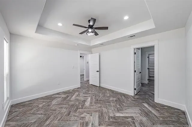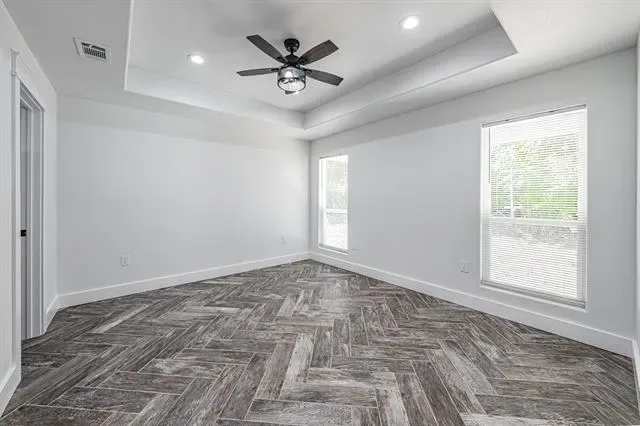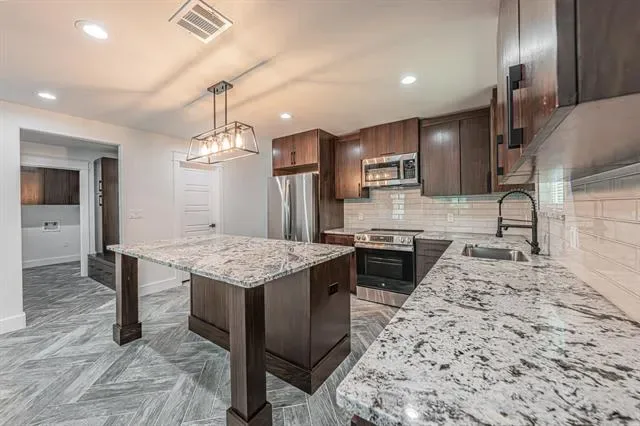 The primary suite is a true escape with its spa-inspired bath, featuring custom tilework, granite vanity, and abundant storage. The entire home is finished with arrow-design wood-look tile flooring, complemented by ceiling fans and decorative lighting throughout.
