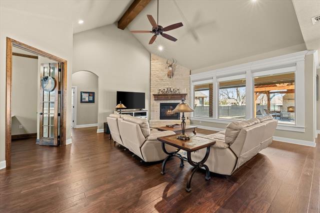 Step inside to find a breathtaking cathedral-vaulted ceiling with an exposed wood beam anchoring the living space, complemented by a beautiful stone gas fireplace that creates a warm and inviting atmosphere. The spacious kitchen is truly the heart of the home, featuring an oversized granite island, gas cooktop, double ovens, two pantries, and generous storage, all flowing seamlessly into the main living and dining areas.