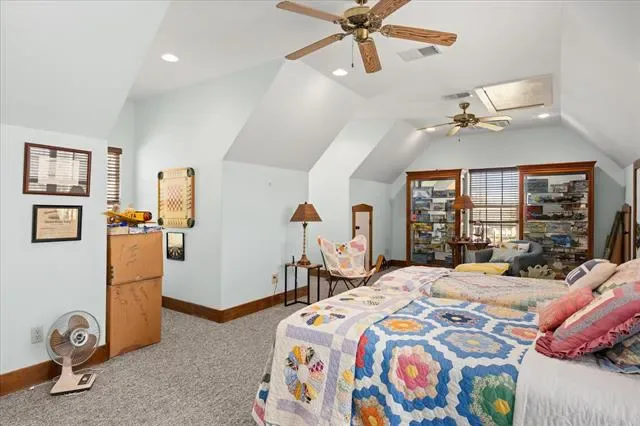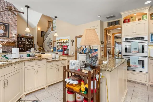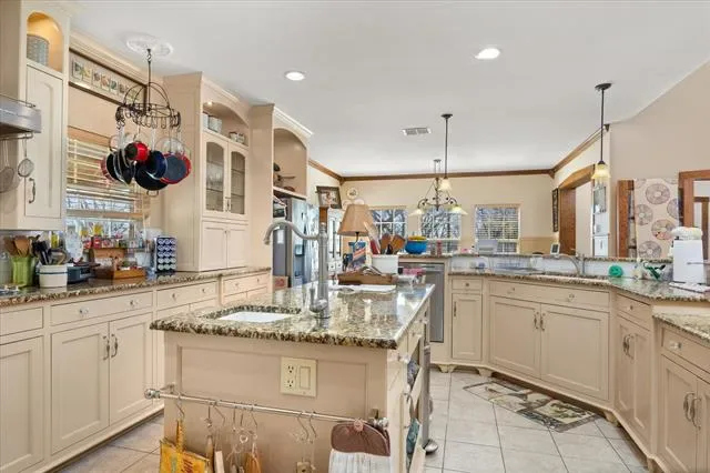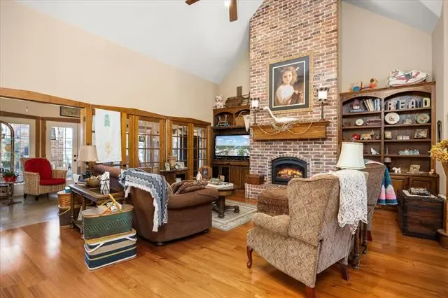 Built in 2007, the home showcases 20-foot vaulted ceilings, custom built-ins, and multiple living areas including a formal dining room, private office or study, and an enclosed sunroom with a striking floor-to-ceiling brick wood-burning fireplace. Thoughtful design continues throughout with abundant storage, including convenient attic-access closets and built-in storage features that make the home exceptionally practical.