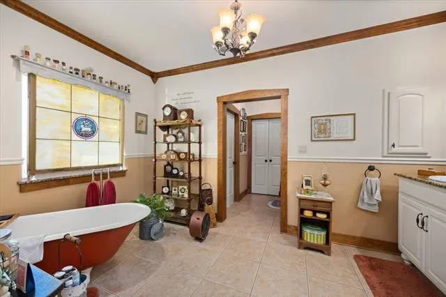 The private primary suite offers built-in bookcases, a wall-length window seat with hidden storage, an oversized walk-in closet, dual vanities, custom cabinetry, and an antique clawfoot soaking tub.
