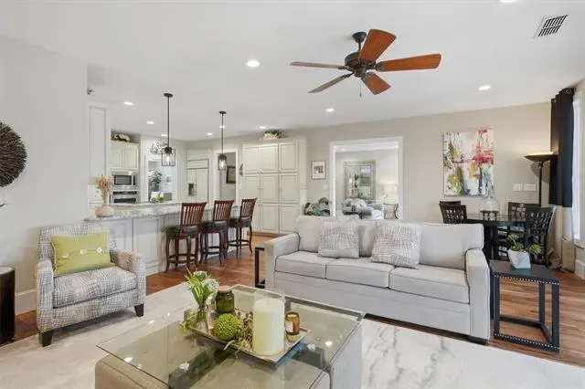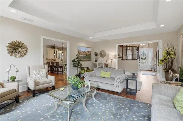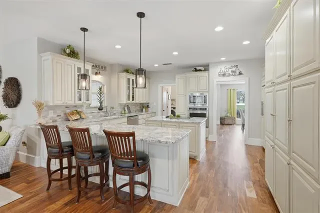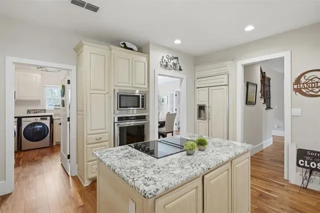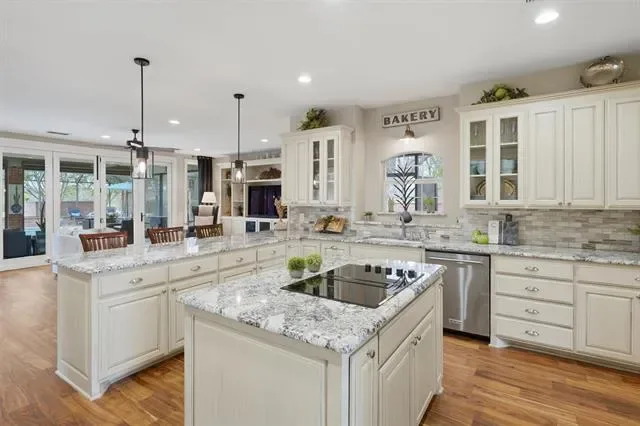Designed for both elegant entertaining &' everyday comfort. At the heart of the home, the gourmet kitchen is a true showpiece. It features custom cabinetry with convenient pull-out spice storage, a premium appliance suite, built-in buffet, JennAir downdraft cooktop, GE Monogram built-in refrigerator, dedicated ice maker, and recessed dimmable lighting—creating the perfect setting for both cooking and entertaining.