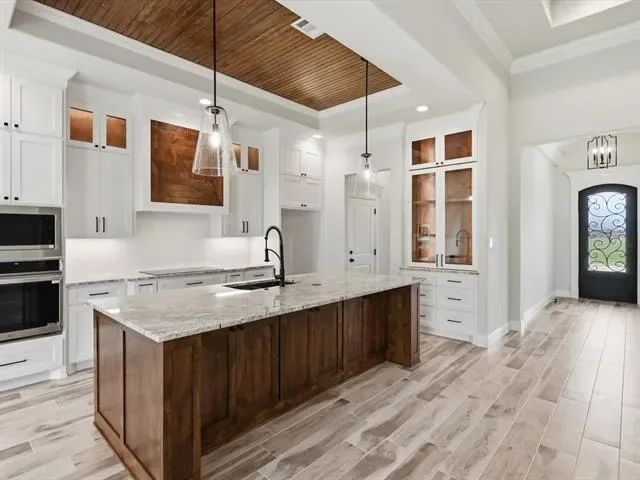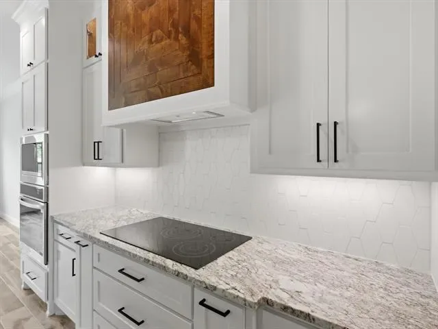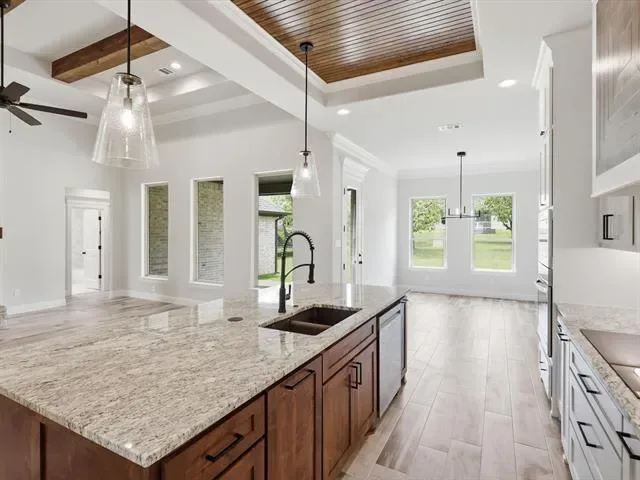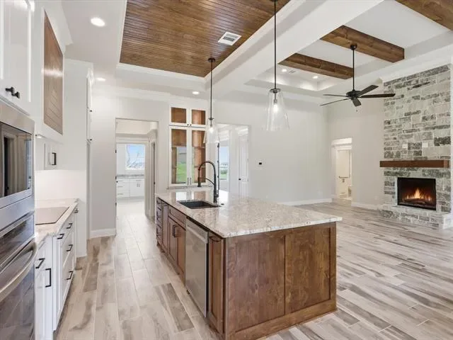 From the moment you enter, the elongated foyer sets the tone, guiding you past a private study that’s perfect for working from home or creating a quiet retreat. The heart of the home opens up with soaring ceilings and a stunning stone fireplace that anchors the living room, flowing seamlessly into a chef-inspired kitchen designed to impress. An oversized island, granite countertops, upgraded cooktop with vent hood, under-cabinet lighting, and a spacious walk-in pantry make this space as functional as it is beautiful. Thoughtful wood accents throughout add just the right amount of warmth and character.