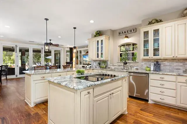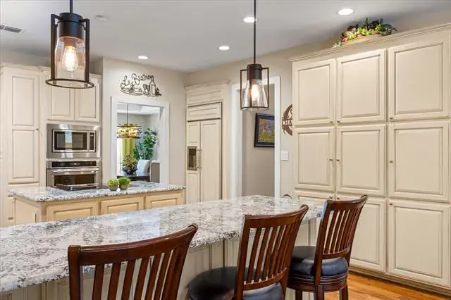 Built-in Features, Cable TV Available, Decorative Lighting, Double Vanity, Eat-in Kitchen, Granite Counters, Kitchen Island, Natural Woodwork, Open Floorplan, Paneling, Pantry, Vaulted Ceiling(s), Walk- In Closet(s)