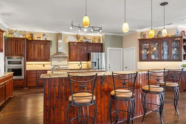 Experience the charm of Texas living with this stunning, rustic style home with many features only found in custom homes. This one of kind property is a peaceful escape or perfect for daily living, offering a combination of comfort, function, elegance, and natural beauty. Step inside to discover a spacious open-concept layout featuring a grand living room boasting a beautiful stone fireplace with a wall of windows overlooking the back of the property. Spacious chef’s kitchen with abundant counters and cabinetry, 2 sinks and Kitchen Aid appliances make for a gathering place to entertain. Plenty of room to seat your guests in the dining room, the kitchen island, and breakfast nook. The primary suite is a true retreat with a fireplace separating the main sleeping area and an office-den room overlooking the back of the property. The bonus room is located upstairs off the primary suite. Spacious with built in desks, storage, and a full shower bath make it perfect for a game room, library, man cave, quiet retreat, homeschool area. Three inviting bedrooms with baths make for privacy with family & guests on the other side of the house. A 4th room is flexible & can be used as additional bedroom or office with half bath. The laundry-utility room has abundant storage, sink, and dog wash station. Lower level offers a 4 car garage & other space currently used as a workout room, woodworking shop,& storage. A walk out at the lower lever is covered to relax, enjoy nature while the upper level offers a composite deck for a spectacular view. The 2 acre lot is partially fenced and offers access to the river with a natural pathway.