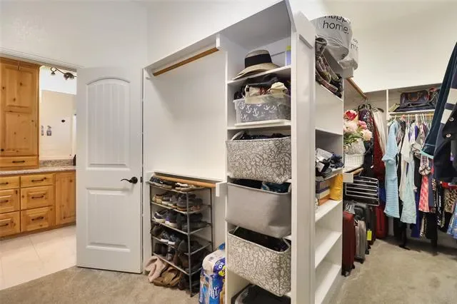 One of the kitchen’s standout features is the oversized walk-in pantry with custom shelving, offering exceptional storage and organization.