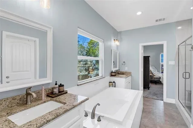 The main level is designed for everyday living and entertaining with an open concept layout anchored by a gourmet kitchen. A large center island, granite countertops, and stainless steel appliances create a functional and polished space that flows seamlessly into the living and dining areas. The primary bedroom is also located on the main floor and offers a private retreat with a spa like bathroom featuring a large soaking tub and granite countertops.