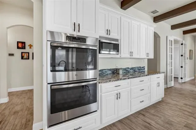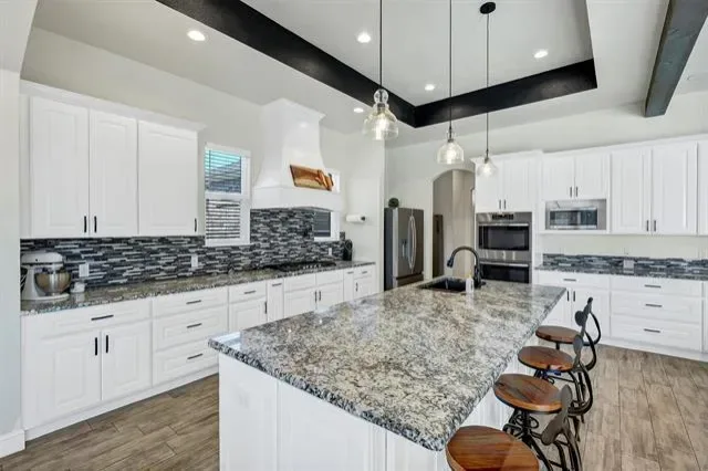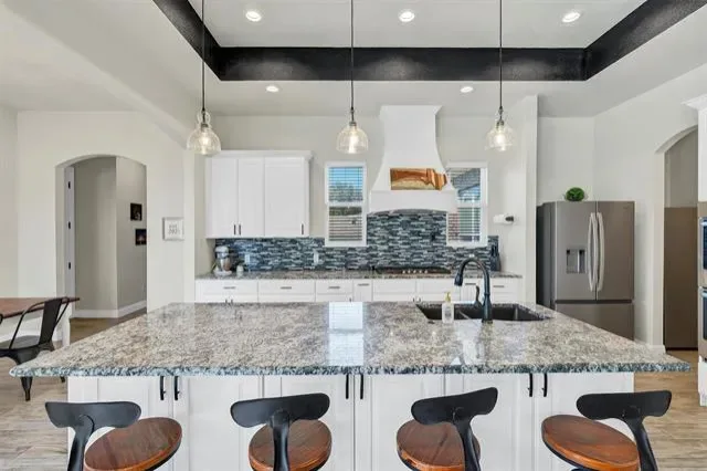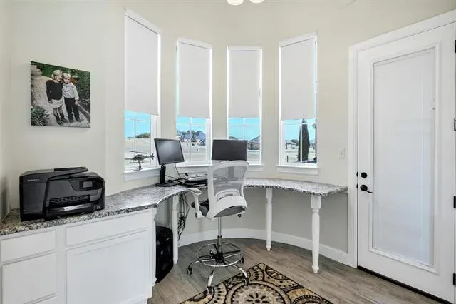 At the heart of the residence is a chef’s kitchen designed to impress, complemented by an oversized pantry, a dedicated wet bar area, and seamless flow into the main living space— showcasing tranquil views of a mature pecan orchard. A separate private office provides an ideal work-from-home retreat.