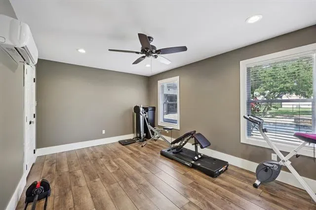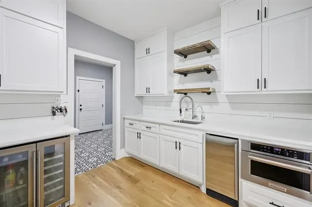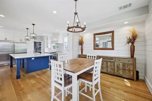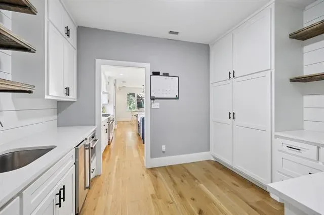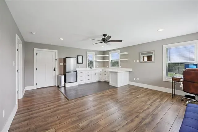 The guest house features water-resistant flooring, a kitchenette-style counter with a mini fridge, a private bedroom, a renovated full bathroom, and its own garage. This space works well for guests, a private office, or extended stays.