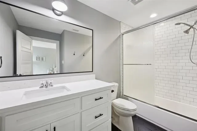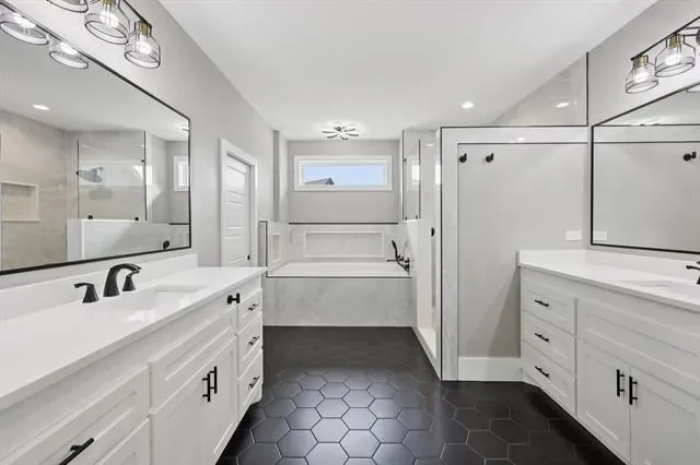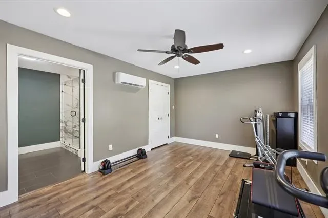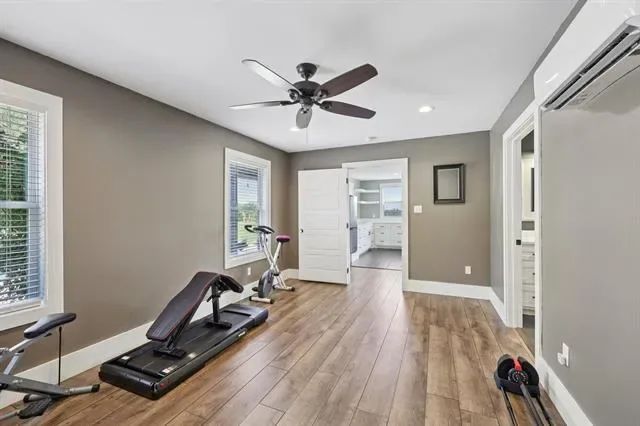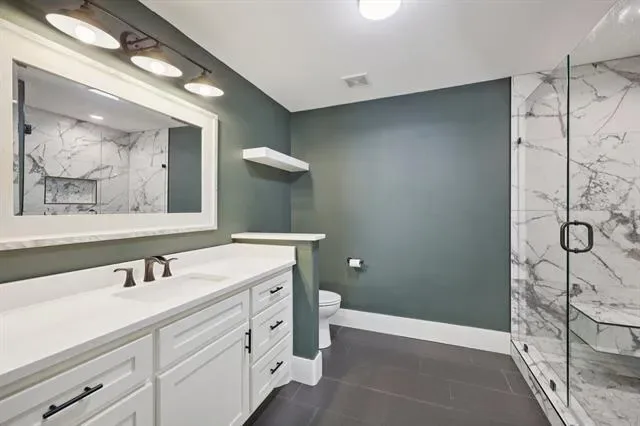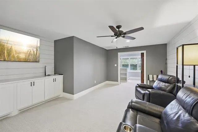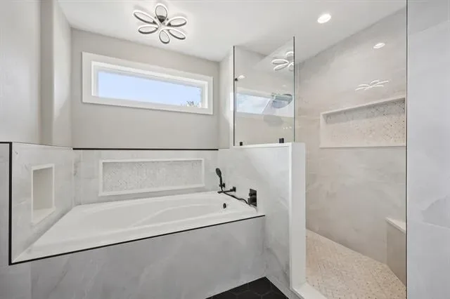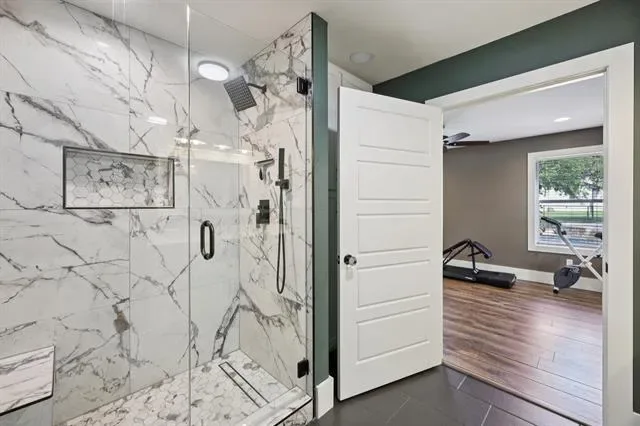 Upstairs are two bedrooms, each with a full bathroom, along with a theater room perfect for entertaining. Downstairs, the primary suite features a renovated spa-style shower, a soaking tub, and soft lighting that creates a relaxing atmosphere. Adjacent is a private office or bonus bedroom with its own entrance.