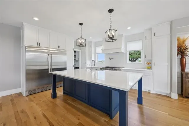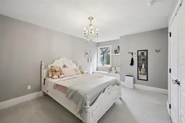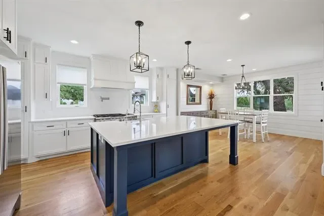 The family living room serves as the heart of the home, offering breathtaking views of the sprawling landscape and backyard oasis. The kitchen features a built-in refrigerator, a large island, a gas stove with a pot filler, and a reverse osmosis water filtration system. The butler’s pantry offers ample space for both food and appliance storage and connects to the mudroom, laundry room, and primary garage.