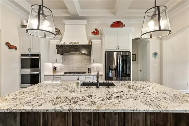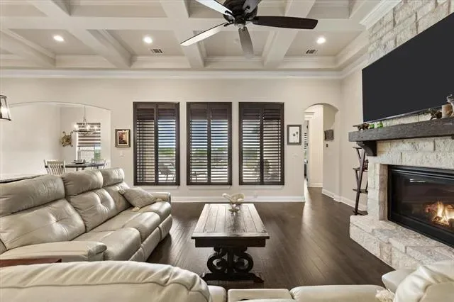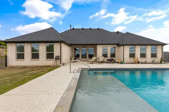 Summer is around the corner & it’s time to relax by the pool & take in the gorgeous views from this stunning Couto home! Situated on an elevated lot & over an acre in size, this four bedroom, three bath home PLUS Office ( or 5th Bedroom) AND Media Room offers an open floor plan, over $12k in custom window coverings, beautiful stone fireplace, granite countertops throughout & much more! As you enter the home, you are greeted with a beautiful iron door entry, coffered ceilings in the living room, stone fireplace & wall of windows overlooking the Texas landscape. The kitchen is a chef’s dream with a BOSCH high end cooktop, 6 month old Kitchen Aid true convection double ovens & air fryer, 6 month old Kitchen Aid dishwasher, plenty of cabinets for storage & large breakfast bar. The master bedroom is spacious & the master bath has stunning, modern tile work surrounding the large soaker tub & walk-in shower. Enjoy your summer days outside on the covered back patio listening to the waterfall or take a dip in the pool to cool off from the Texas heat!