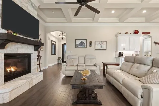 Summer is around the corner & it’s time to relax by the pool & take in the gorgeous views from this stunning Couto home! Situated on an elevated lot & over an acre in size, this four bedroom, three bath home PLUS Office ( or 5th Bedroom) AND Media Room offers an open floor plan, over $12k in custom window coverings, beautiful stone fireplace, granite countertops throughout & much more! As you enter the home, you are greeted with a beautiful iron door entry, coffered ceilings in the living room, stone fireplace & wall of windows overlooking the Texas landscape. The kitchen is a chef’s dream with a BOSCH high end cooktop, 6 month old Kitchen Aid true convection double ovens & air fryer, 6 month old Kitchen Aid dishwasher, plenty of cabinets for storage & large breakfast bar. The master bedroom is spacious & the master bath has stunning, modern tile work surrounding the large soaker tub & walk-in shower. Enjoy your summer days outside on the covered back patio listening to the waterfall or take a dip in the pool to cool off from the Texas heat!
