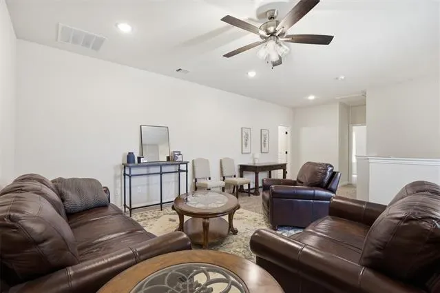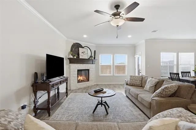 The open concept main living area is filled with natural light and anchored by a stone fireplace, flowing seamlessly into the dining space and kitchen. The kitchen features granite countertops, abundant cabinetry and a large island that works for both daily living and entertaining. Upstairs you’ll find generously sized bedrooms including a spacious primary suite with dual vanities and a walk-in shower, along with a second living area that offers flexible space for a media room, office or playroom. Additional highlights include a 2 car garage, keyless entry smart lock on the half glass front door and a dedicated laundry room complete with built in cabinetry and countertop workspace. Step outside to a private fenced backyard, while the HOA covers lawn maintenance for easy, low maintenance living. This home also offers a unique level of flexibility. It can be purchased fully furnished including washer, dryer, refrigerator and household items or vacant depending on buyer preference. Whether you’re looking for a primary residence or a turnkey opportunity, this home delivers both space and convenience in a great location.