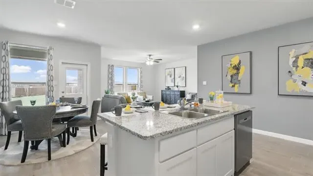 Beautiful new D.R. Horton home in the Saratoga community located in Granbury and Granbury ISD! The single-story Natchez floorplan, elevation H, with an estimated Summer completion, features 4 bedrooms, 2 bathrooms, and a 2-car garage with an open-concept layout that connects the family room, dining space, and modern kitchen for easy everyday living. The kitchen offers quartz countertops, 36” upper cabinets with crown molding, stainless steel appliances, electric range, stainless steel drop-in sink, a large center island, and a walk-in pantry. The private primary suite includes an en-suite bath with dual quartz vanities, a 5-foot oversized shower, and a walk-in closet located off the bathroom. Secondary bath includes a quartz vanity, and luxury vinyl plank flooring runs throughout the main areas and wet zones. Energy-efficient construction and America’s Smart Home Technology come standard—plus covered back patio, full sod, sprinkler system, privacy fencing, and professional landscaping. Saratoga residents can access two community parks, Highway 377, Saratoga Blvd, Lake Granbury, Granbury City Beach Park, HEB, Harbor Lakes Golf Club, and Motor Sport Ranch within minutes.