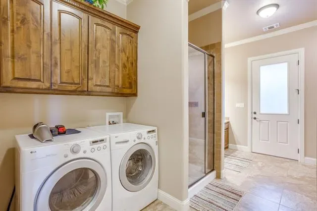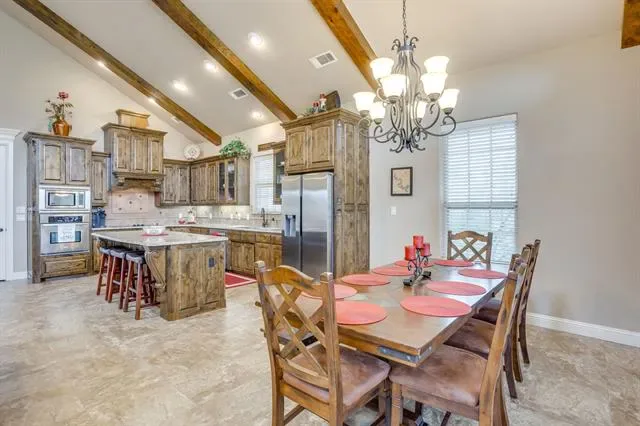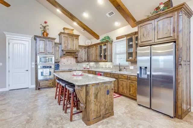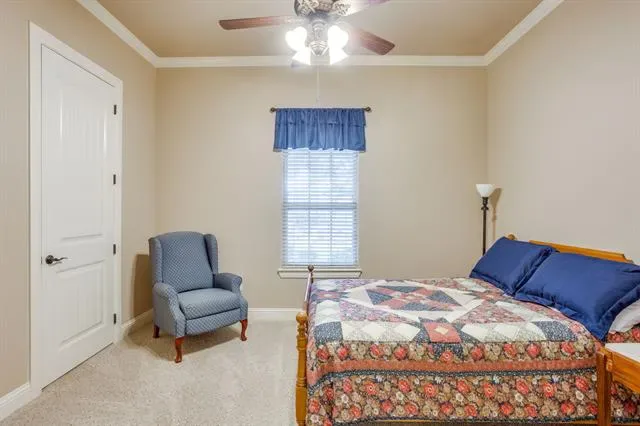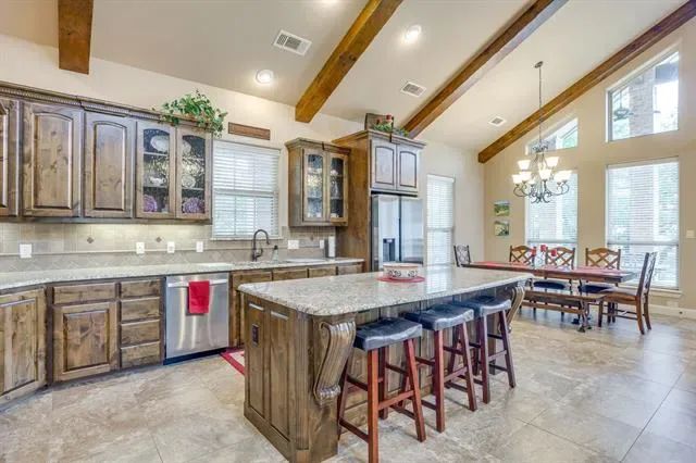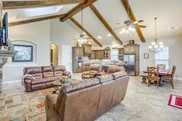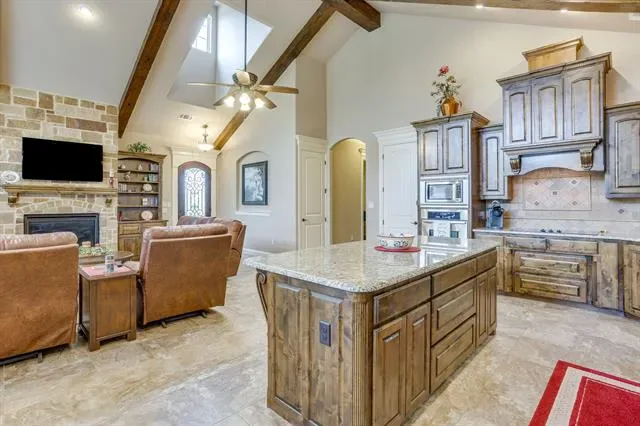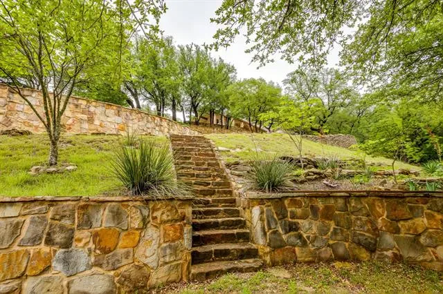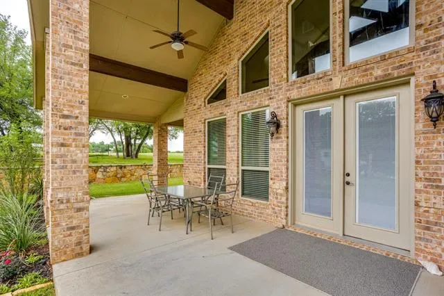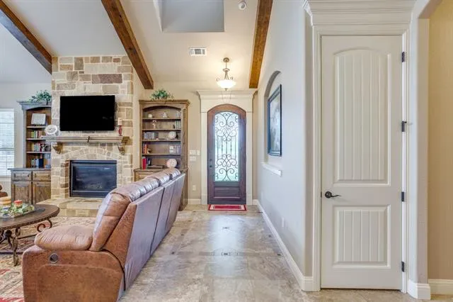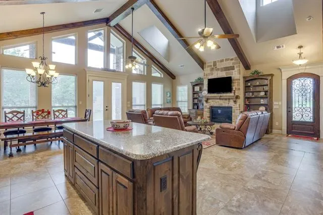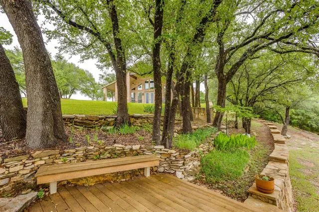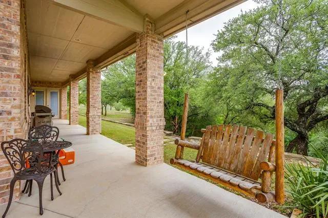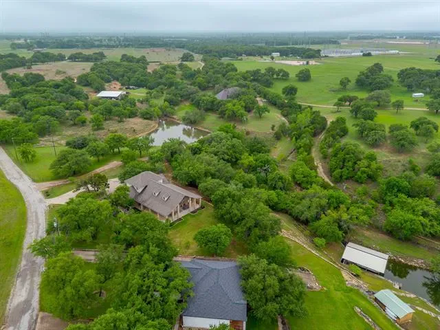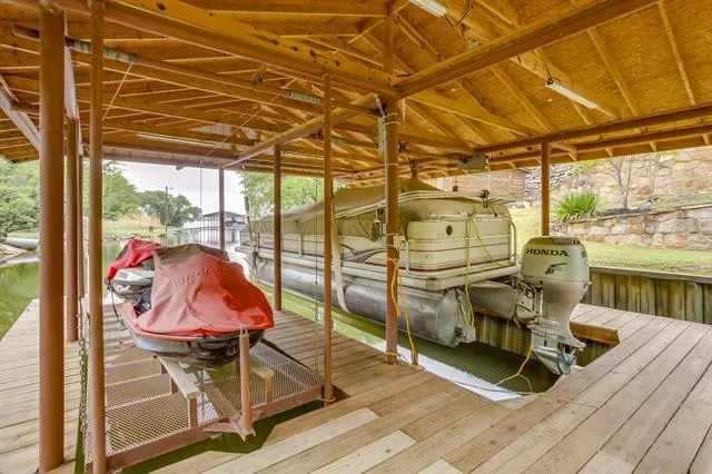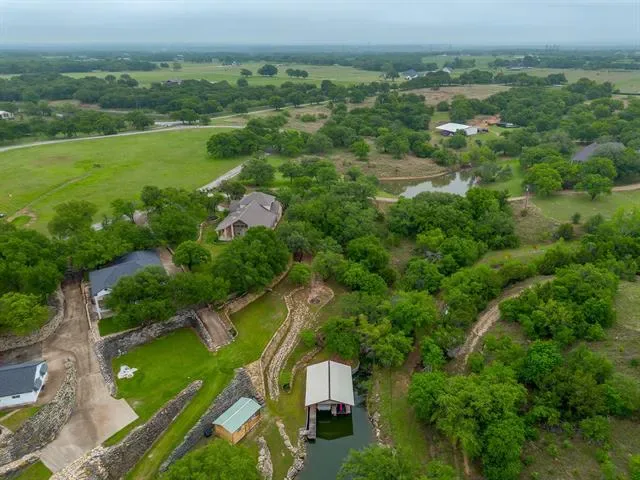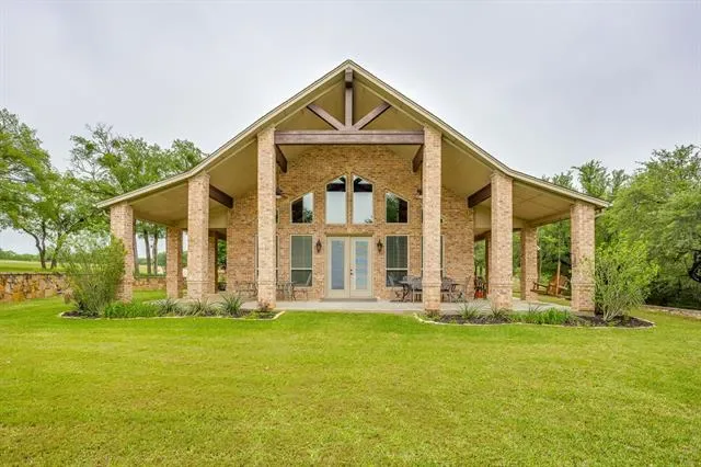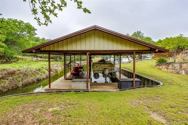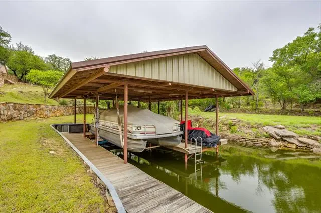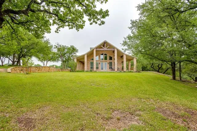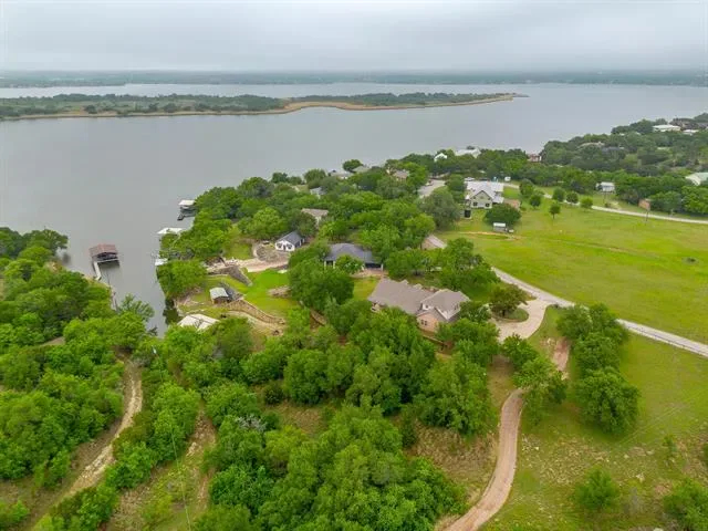 Set on a quiet, private stretch of waterfront on the Fort Worth side of Lake Granbury, this rare custom home offers the ideal balance of seclusion, accessibility, and a beautiful view of the lake. Positioned in a protected cove with a clear sightline to the main body of water, the property delivers both calm shoreline living and scenic water vistas. Built in 2012 by Couto Homes, this fully custom 4-bedroom, 3-bath home was thoughtfully designed with oversized walkways and doorways to provide ease of movement and wheelchair accessibility throughout. The open-concept floor plan is anchored by expansive floor-to-ceiling windows that frame the lake, filling the home with natural light and uninterrupted views. The main living area features a gas fireplace and flows seamlessly into the kitchen and dining spaces, creating an ideal setup for both everyday living and entertaining. The primary suite is located on the main level and includes a private exterior door leading directly to the wraparound porch, perfect for quiet mornings or evening lake views. Outdoor living is a standout feature, with a wraparound porch spanning three sides of the home (excluding the garage side), offering multiple vantage points to enjoy the water and surrounding landscape. The 1.29-acre property consists of three parcels, with the main parcel currently benefiting from an agricultural exemption.