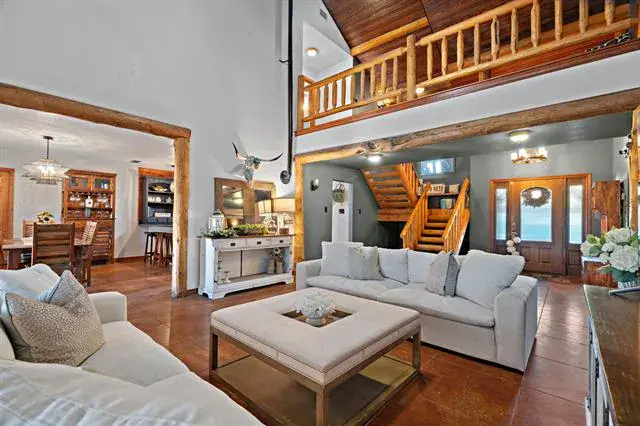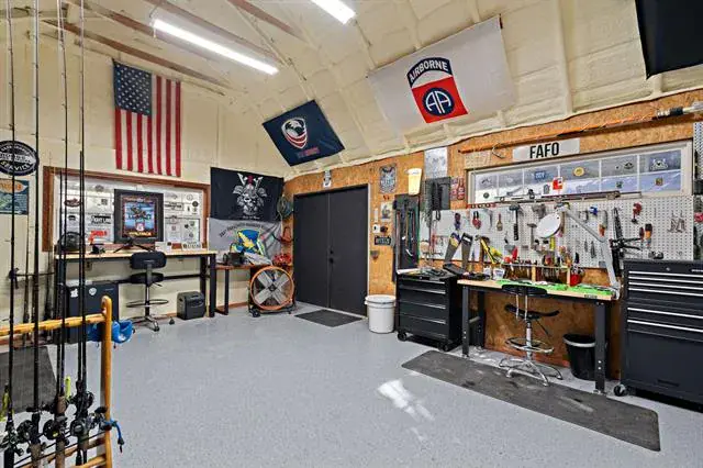 This waterfront haven features a double spiral staircase that leads down to a recreational paradise. Enjoy 3 concrete boat slips, 2 of which are covered, convenient kayak storage, &' multiple spots to relax right by the lake. The fully heated, cooled, &' insulated 16''x24'' workshop, 2-car garage with upgraded modern doors, &' additional covered parking offer plenty of room for all your lake toys.