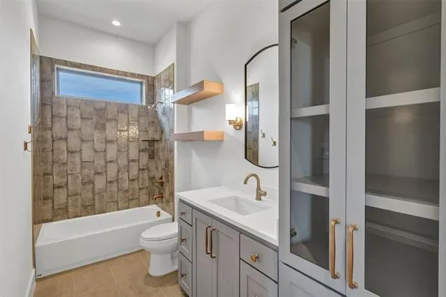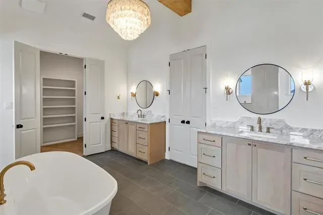 The primary suite stands out with its vaulted ceiling and a spa-inspired bath that feels both expansive and serene. Clean lines, upscale finishes, and balanced design create a space that feels luxurious yet livable.