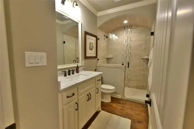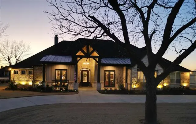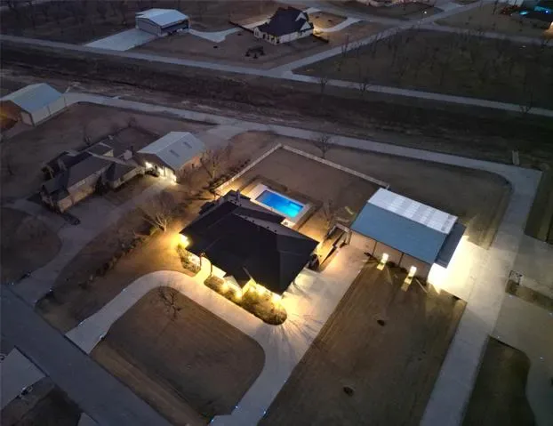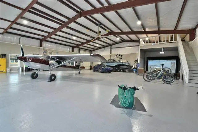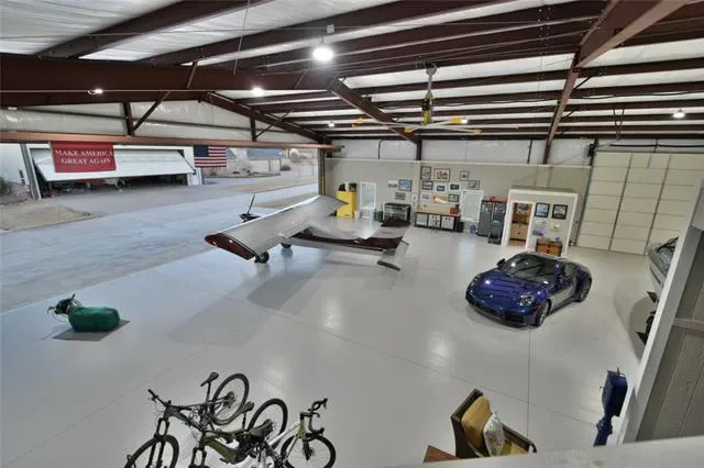 Better than new, full custom home located in the highly desired The Landings Airpark (FAA Identifier 66TE). This thoughtfully designed residence offers an open-concept layout with hand-scraped, nail-down hardwood flooring throughout and no carpet or tile. Architectural details include high-beam ceilings, 8 ft doors, hand-troweled walls, and extensive trim and crown molding. Double French doors open to both the front sitting porch and the rear patio, creating comfortable indoor-outdoor flow. Piano room can easily be 4th bedroom. Additional features include plantation shutters, solid wood custom barn doors at the office and primary suite, dovetail soft-close drawers, and granite and marble countertops throughout the home. Includes a 1-year-old Class 4 roof, dual upgraded Trane HVAC systems, a ventless gas fireplace with auto-light, and an extra-deep 4-car garage with custom insulated doors. The kitchen is well equipped with stainless KitchenAid appliances, a 48 inch Wolf rangetop with griddle, pot filler, apron sink, and a remote-controlled range hood, along with a large pantry, butler’s pantry with wine cooler, and extensive cabinetry and storage. The oversized primary suite features a Dutch vaulted ceiling, a spacious custom bath with dome ceiling, and a finished walk-in closet. Bathrooms include four walk-in showers, three of which are doorless, with tile extending from floor to barrel ceiling. Outdoor living is highlighted by an 18×38 PebbleTec saltwater pool, Intelli-Connect controlled, surrounded by an oversized patio with outdoor kitchen, wood-burning gas fireplace, motorized retractable screens, and polyurea-coated flooring, providing a comfortable space for everyday use and entertaining. The 60×60 hangar offers excellent utility with a 54 ft Higher Power door, polyurea-coated floors, 14 ft Big Ass fan, 12 ft high siding with loft storage, a bathroom, 50-amp RV plug, and an RV door, making it suitable for aircraft storage, RV use, or additional workspace.