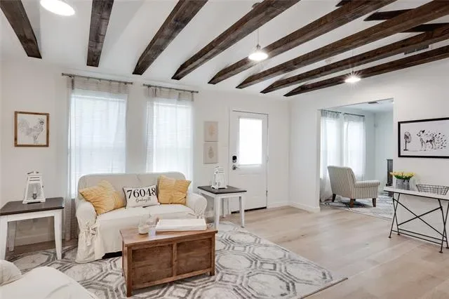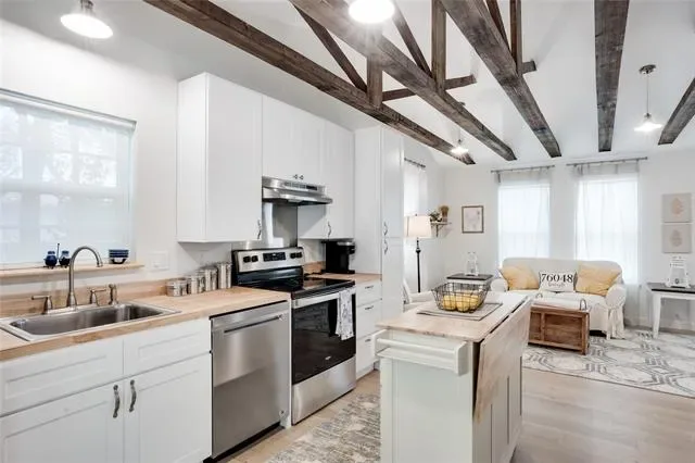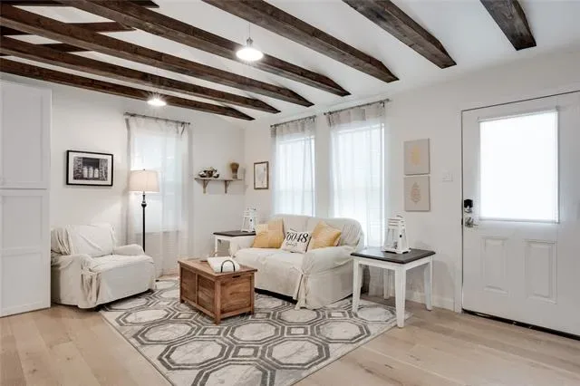 Inside, exposed wooden truss beams create a warm, modern rustic feel that sets the tone for the thoughtfully updated interior. The home has been well maintained and features a new roof, providing added peace of mind.