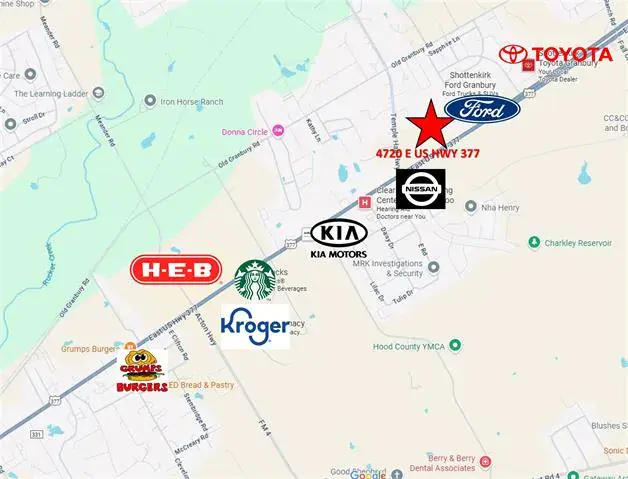 Incredible opportunity to own a high-visibility commercial tract in the heart of Granbury, Texas — voted the Best Historic Small Town in America. This property offers over 350 feet of direct frontage on Highway 377 with an estimated daily traffic count exceeding 25,000 vehicles, making it a premier location for any commercial development. Situated within Granbury city limits, this parcel is ideally positioned between major national retailers and automotive dealerships. Just east of HEB, Kroger, Starbucks, Marshalls, and Granbury Nissan &' Kia — and west of Ford, Hyundai, Jeep, and Toyota dealerships — your future business will be in thriving company. Surrounded by several new and expanding residential subdivisions, this property benefits from a strong customer base and exceptional long-term growth potential. Mature oak trees offer natural beauty and shade, while the rectangular shape and level topography provide flexible design options for development. Ideal for a variety of commercial uses, including, Automotive Sales, Gas Station, Office Building, Church, Industrial, Manufacturing, Warehouse or Distribution Center. Don’t miss your chance to secure a rare, high-traffic location in one of Texas’ most desirable small-town markets. This is THE spot for your next business endeavor.
