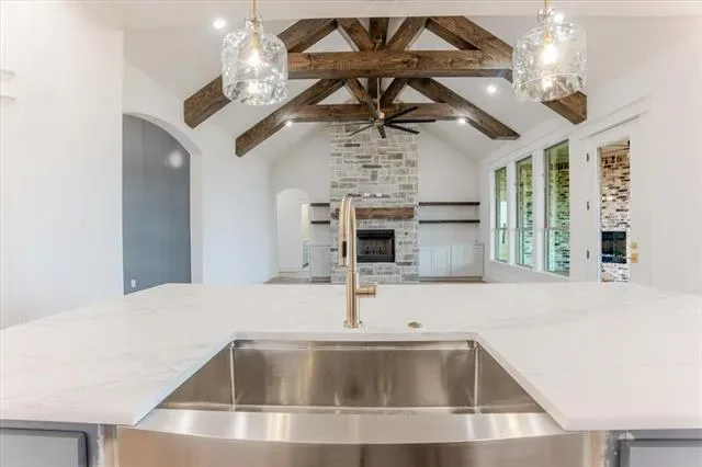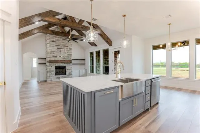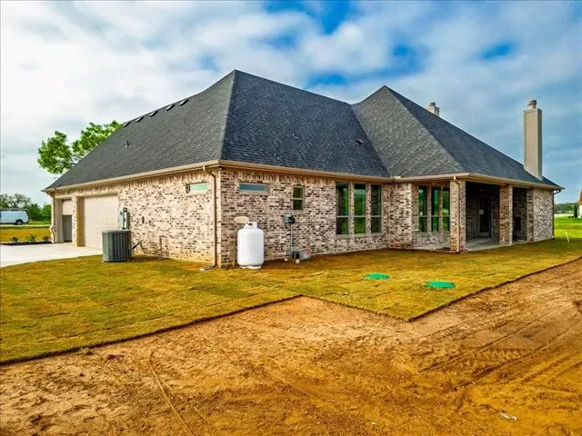 Need a WORKSHOP with your home?? FREE WATER?? This 2+ acre energy efficient, new build property is serviced by a WATER WELL. It features a 3-car garage, extended concrete drive, and an impressive 30×40 workshop with electric, 12×14 commercial door, side-mount lift system, LED lighting, 50-amp plug, and 20-amp circuit. Interior features include GE Profile app-controlled appliances, large farm sink, kitchen undermount and uplighting, pendant lighting, trash drawer, and an office. Enjoy both indoor and outdoor wood-burning fireplaces. The luxury primary suite offers tray ceiling, a garden tub, walkthrough shower, and a custom oversized closet. Additional upgrades include engineered foundation, water heater, 17-SEER Trane HVAC, LED lighting, and FULL SPRAY FOAM INSULATION INCLUDING THE ATTICn 100 gallon propane tank for cooktop, beverage cooler, and wifi appliances.