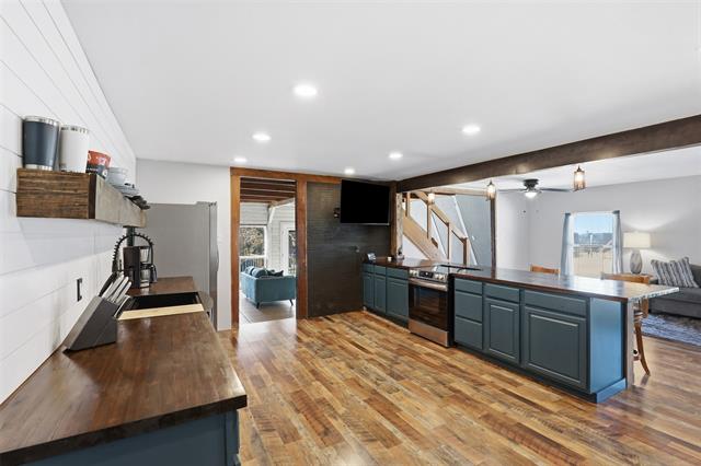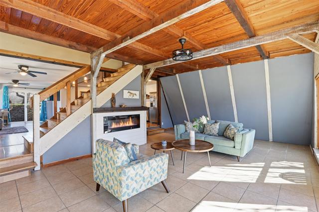 PRICE IMPROVEMENT – Exceptional Value! Now one of the best-priced homes per square foot in the neighborhood. This is not your typical A-frame. While it features the charm of A-frame architecture, much of the home is traditional construction, creating a layout that feels larger and more functional than most A-frames. This turnkey, professionally renovated home blends character with modern comfort. The inviting living room features wood ceilings with exposed beams and a sleek electric fireplace, creating a warm and cozy gathering space. The fully remodeled kitchen is designed to impress with butcher block countertops, brand-new cabinetry, new appliances, and a spacious walk-in pantry—perfect for everyday living and entertaining. A versatile game room with a charming barn door adds flexible living space ideal for recreation, a home office, or a second living area.