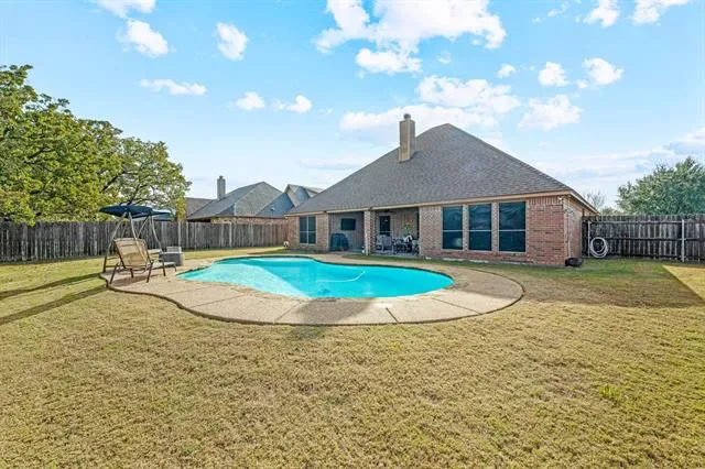 Welcome to this beautifully maintained 4 bedroom, 2 bath single story home in the desirable Willow Ridge community of Granbury on the Fort Worth side of Granbury. This home features a spacious living area with a stone fireplace, a well appointed kitchen with abundant knotty alder cabinetry, and a generous pantry for extra storage. The primary suite includes a large bathroom and walk in closet, while the front 4th bedroom is perfect for an office, guest room, or hobby space. Step outside to your own backyard retreat with a covered patio overlooking the pool ideal for relaxing, entertaining, or cooling off on warm Texas days. The lot provides plenty of yard space along with a storage shed for tools or equipment. Located in a peaceful neighborhood near schools, shopping, and dining, this home offers comfort, convenience, and a great layout for everyday living.