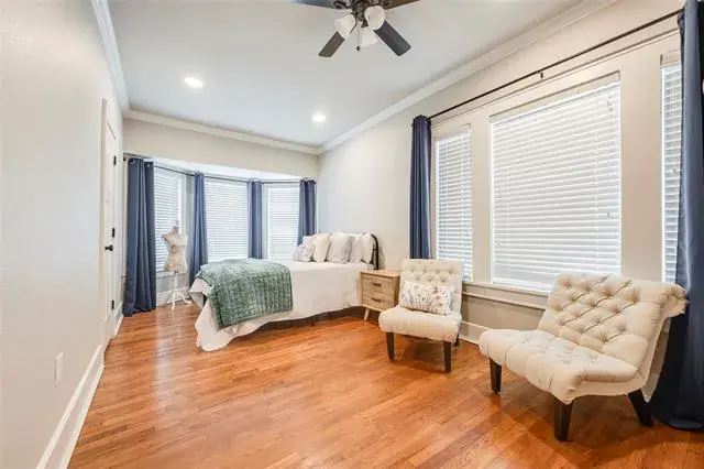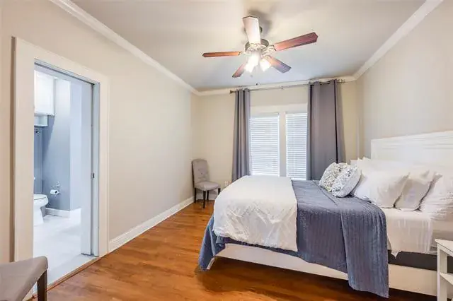Step inside to discover original hardwood floors, custom millwork, and distinctive architectural touches throughout, including pocket doors and a built-in coffee and wine bar. Each bedroom features its own private ensuite bath, providing the ideal balance of comfort and privacy for family and guests. Additional highlights include dual primary closets with secondary washer and dryer hookups, two inviting living areas, and an eat-in kitchen designed for everyday ease.