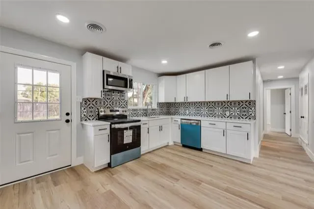 Beautifully renovated 3-bedroom, 2-bath home with 1,428 sq ft of living space located at 5017 Sabelle Lane, Haltom City, TX 76117. This stunning single-story property features an open-concept layout with a brand-new kitchen including quartz countertops, shaker cabinets, stainless steel appliances, and a designer backsplash. Beautifully renovated throughout, this home showcases new luxury vinyl flooring that runs across the entire house. Both bathrooms are completely updated with modern tile, vanities, and fixtures. The home also offers fresh interior and exterior paint, updated lighting, and new trim and doors. A spacious 2-car garage includes extra storage space along with brand-new garage doors and motors. The large fenced backyard provides plenty of room for entertaining, gardening, or pets. Conveniently located near Highways 121, 183, and I-820, this move-in-ready home is just minutes from shopping, parks, restaurants, and downtown Fort Worth.