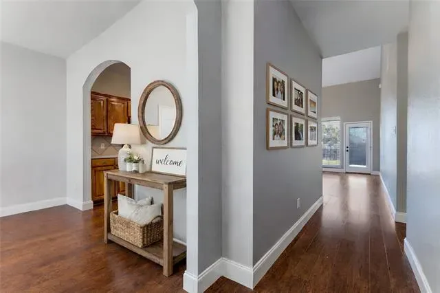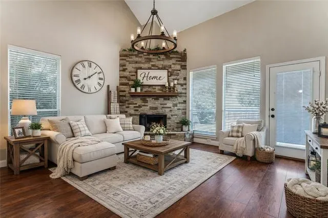 THIS HOME QUALIFIES FOR 0% DOWN! Beautiful Farmhouse on Large Corner Lot with Private Gated Drive! The custom glass etched front door & stone landscape beds welcome you through the 17×6 front porch, perfect for rocking chairs. Inside find neutral paint, pergo wood flooring and lots of storage throughout. The formal dining room has an arched entry access to the large kitchen with wine storage, bar service counter tops, extensive walnut cabinets, built in microwave and walk in pantry. The living room has high ceilings with a grand stone gas start fireplace and guest access to the powder bath with pedastal sink. The primary ensuite boasts a large soaking tub, separate shower w rainhead fixture, two vanities and walk in closet. The dedicated study in an ideal location makes the perfect retreat with custom built ins. The custom wooden spindle banister welcomes you upstairs into the 17×13 gameroom equipped with a fridge and dry bar. Two beds up are large with ample closet space and have direct access to the full bath with shower tub combo, walnut cabinets and linen closet. Outside find a 17×5 covered patio plus a 17×8 grass inlaid stone extended patio. Mature crepe myrtles accentuate the large yard with extended drive for additional parking or outdoor recreation. 2020 Roof. 2020 Exterior Painted.