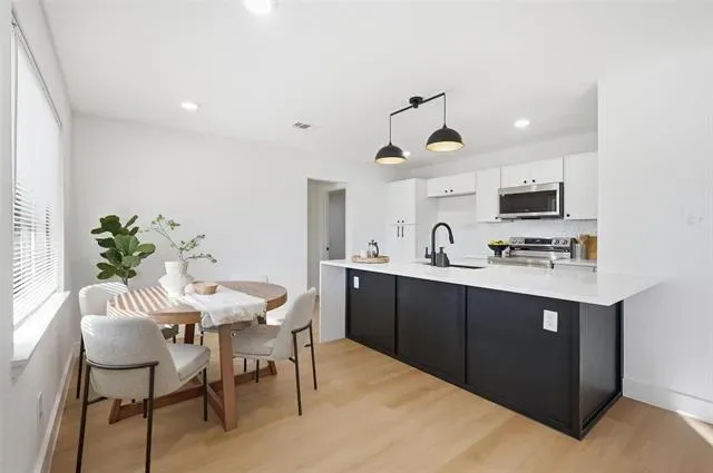 Enter to an bright, open-concept layout featuring brand-new luxury flooring, fresh paint, recessed lighting, smooth ceilings, and abundant natural light. The chef’s kitchen shines with new cabinets, quartz countertops, stainless steel appliances, a large island, and plentiful storage—perfect for family meals or hosting. Both bathrooms are fully reimagined with contemporary tile, vanities, fixtures, and spa-inspired touches.