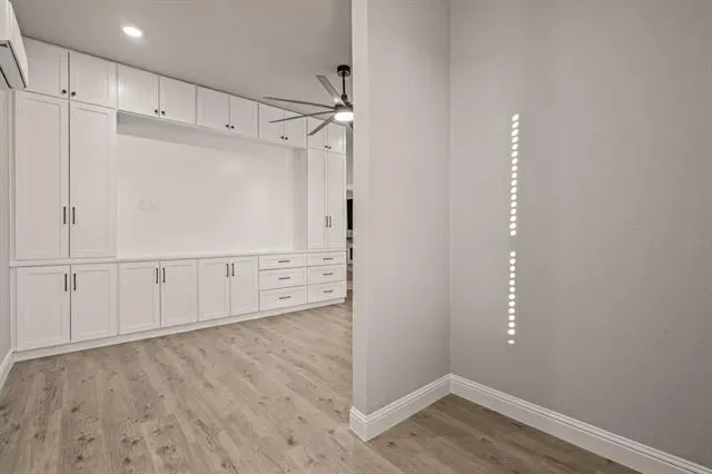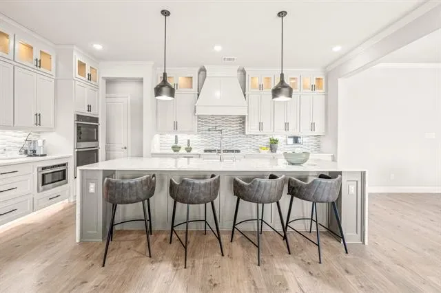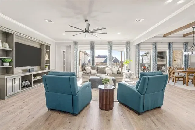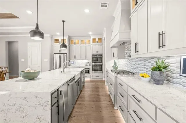 Inside, elegant flooring flows through an expansive great room with custom built-ins and a dramatic corner stone fireplace overlooking the backyard oasis. The chef’s kitchen impresses with a quartz waterfall island, gas 5-burner cooktop with pot filler, double ovens, dual dishwashers, built-in ice maker, soft-close cabinetry, filtered drinking water, and whole-home water softener. The dining area features a beautiful wood-beamed ceiling and seamless connection to the kitchen and great room.