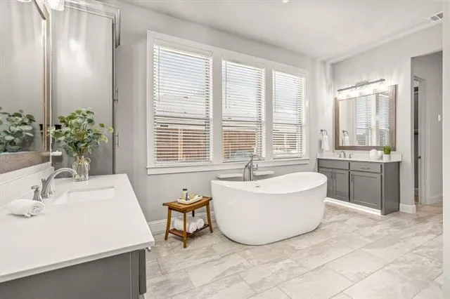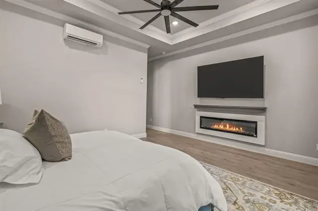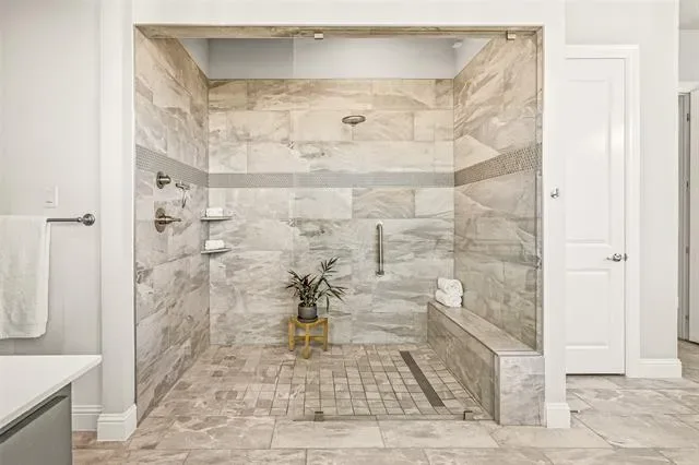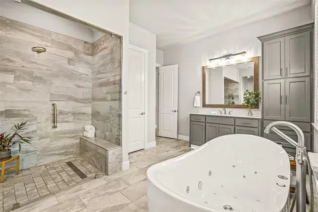 Privately situated in its own wing, the primary suite offers a decorative fireplace and spa-inspired bath with heated jetted tub, oversized rain shower, and dual vanities. An adjoining flex space works beautifully as an office, nursery, or private lounge. Two additional bedrooms share a Jack-and-Jill bath, while a fourth bedroom enjoys its own ensuite. A dedicated media room completes the home.