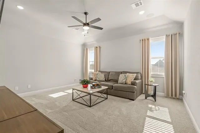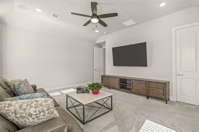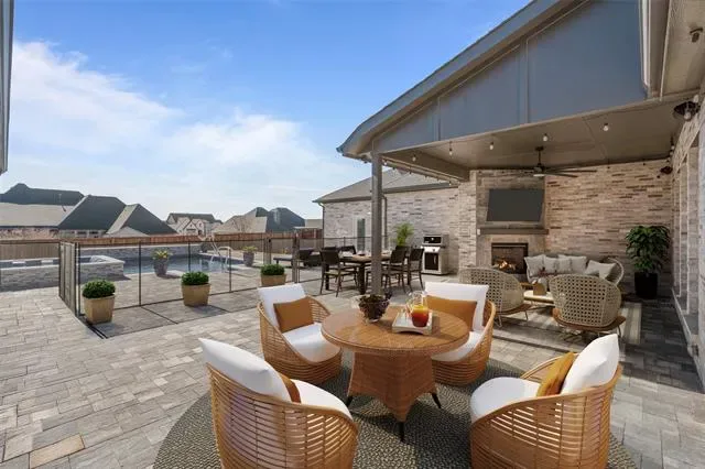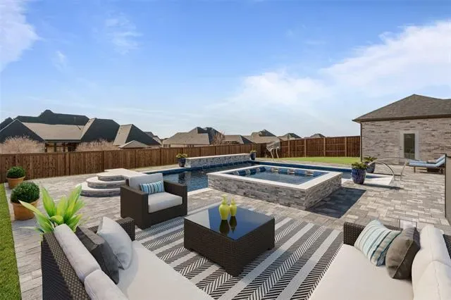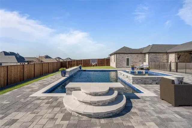 Your private resort-style retreat awaits—where a sparkling pool with cascading waterfalls, tanning deck, and hot tub anchor expansive outdoor living spaces designed for exceptional Texas evenings. Artificial turf, fruit trees, raised garden beds, and a covered patio with fireplace create the perfect setting for both relaxation and entertaining.