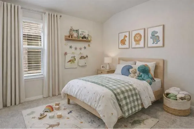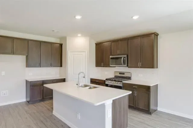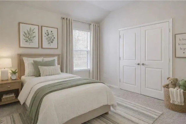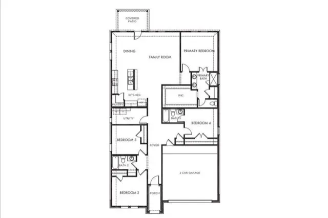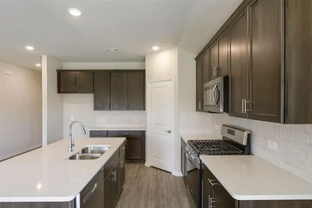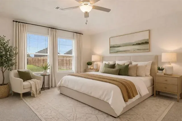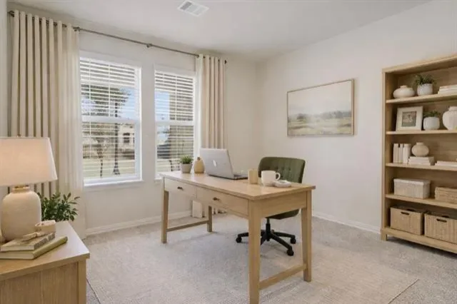 The open-concept living area flows seamlessly to the covered back patio, creating an ideal setup for indoor-outdoor entertaining. The home showcases the sought-after Balanced design package, including dusk cabinets, white quartz countertops, beige EVP flooring, and dark gray tweed carpet for a warm, modern aesthetic.