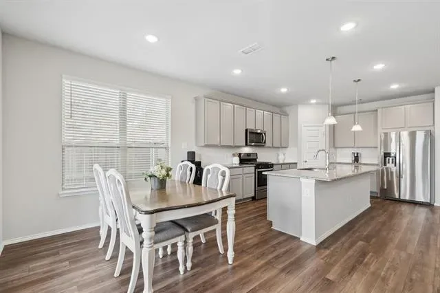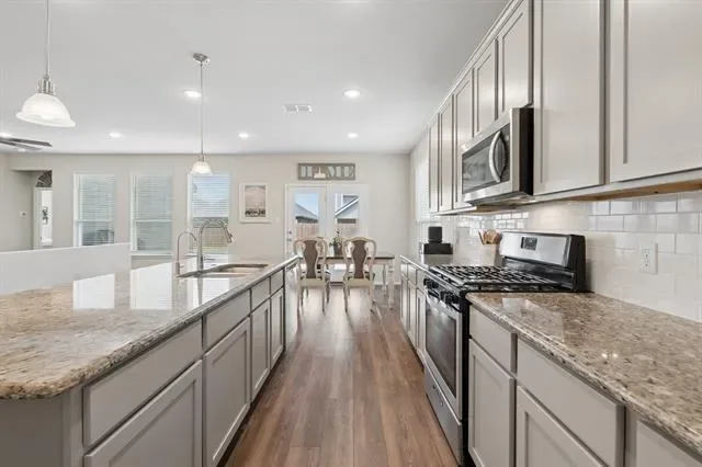 WHY WAIT for the next phase of construction? This move-in ready home offers the feel of new construction with the added benefit of completed upgrades and immediate availability*Beautifully maintained 6-bedroom, 4-bath home located in the highly sought-after Northstar community of Haslet, zoned to Northwest ISD &' within walking distance to Carter Elem*Built in 2021, this popular Boxwood floor plan offers 3,621 square feet, 3 generous living areas, &' a 3-car garage*The well planned layout features 2 bedrooms &' 2 full baths on the main level, ideal for guests or multi-generational living*Upstairs includes 4 addl bedrooms &' 2 full baths. The expansive upstairs living area is incredibly versatile &' currently serves as both a game room &' media area, offering plenty of room for entertaining, relaxing, or working from home. Most bedrooms feature large walk-in closets*At the heart of the home, the kitchen is both stylish &' functional, showcasing 42-inch Dakota maple cabinetry, oversized island, granite countertops, undermount sink, gas range, &' space-saver microwave*An open-concept design allows for seamless flow into the main living &' dining areas, making it ideal for everyday living &' entertaining*The valuable upgrades include CAT 6 data wiring for enhanced connectivity, tankless water heater, whole-house energy-efficient insulation, &' RainSoft whole-house water filtration system w-reverse osmosis—adds both comfort and long-term value*Private primary suite features an extended dual-sink vanity, relaxing garden tub, oversized separate shower, &' a unique three-section walk-in closet that conveniently connects to utility room*Step outside to enjoy the 25×15 partially covered extended patio, perfect for outdoor dining, entertaining, or simply unwinding*Addl features include gutters, blinds thruout, ceiling fans in all bedrooms, &' attractive stone landscaping borders that enhance the home’s curb appeal*Amenities include community pool, splash pad, playgrounds &' walking trails!